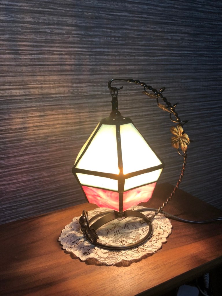 そして完成したのがこのランプ。ヤカゲニーのオフホワイトのベースにブルズアイのピンクの端ガラスを合わせて。とても素敵です!永く愛用していただきたいなぁと思います。