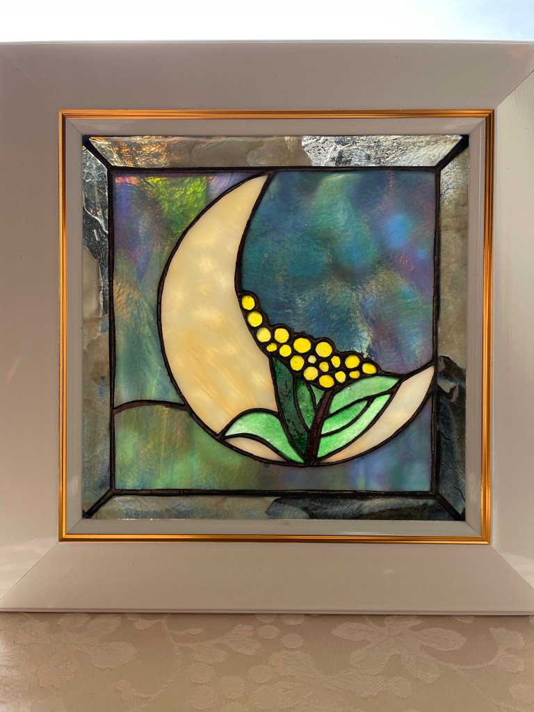昨年の体験教室で作っていただいたミニパネルをアレンジして、かなり細かいピース使いの作品に仕上げました。「月映えのミモザ」です。