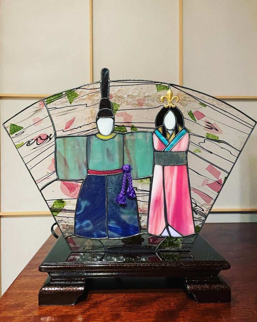 明日はお雛様。既成のパターンをアレンジして立ち雛のミニパネルを作ってみました。お雛様のガラス選びは着せ替え人形遊びをしているようでワクワクしました。
